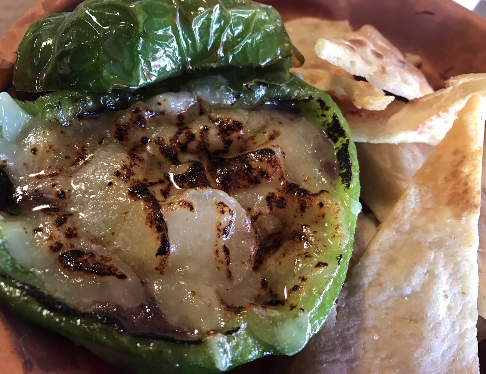 Entre licores, botellitas y brebajes llegó el aperitivo. El ‘Stuffed Pepper’ es un pimiento rostizado que aún preserva su crunch de frescura. Está relleno con refrito de habichuelas, rociado con un aromático aceite de trufas y cubierto con queso manchego.